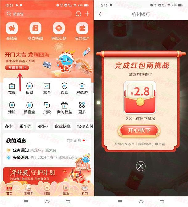 小编提示:注册过杭州银行二类电子卡的去,打开杭州银行APP,首页点【开门大吉龙腾四海】进去,打卡参加红包雨,刚中2.8元微信立减金,中到的微信立减金可以在微信支付选择杭州银行二类电子卡就可以抵扣,在宝石山APP里注册的二类电子卡也可以