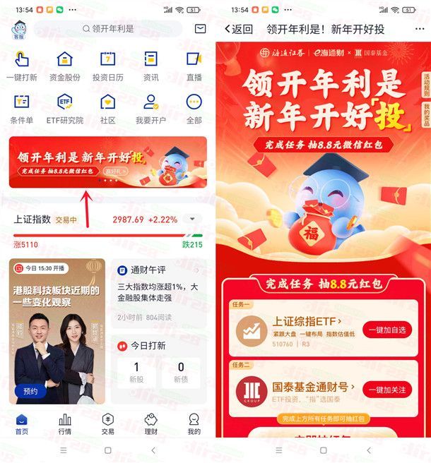 参加海通证券举办的领开年利是抽红包活动,这个活动只要简单注册就行,无需开户,通过下载打开“海通e海通财”APP,点底部“首页”再点横幅图片“领开年利是”进去活动里,完成2个简单的一键关注任务就可以抽奖1次,有机会中到一个最高8.8元的微信红包,小编测试中到0.66元,中到红包复制兑换码到微信搜索公众号“海通证券e海通财”回复“新年开好投”点击推送进去兑换就会推送。
