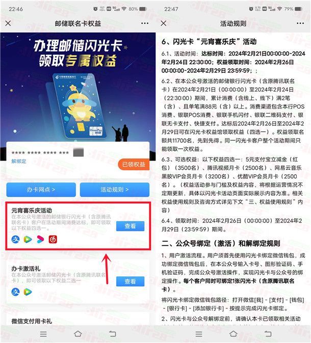 邮储闪光卡元宵消费达标领5元支付宝红包、腾讯视频会员