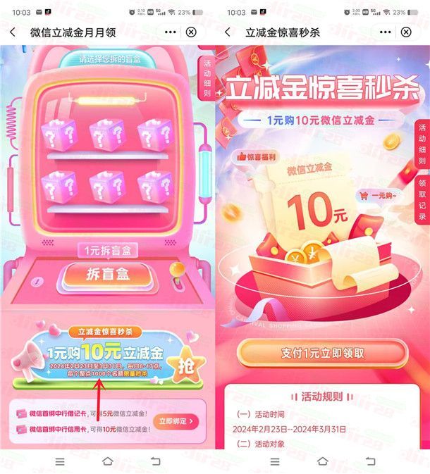 小编提示:打开中国银行APP搜索【微信立减金】进去月月领活动里,下拉页面点击横幅【1元购10元立减金】进去,就可以支付1元购买到10元微信立减金,每个整点限量1000份