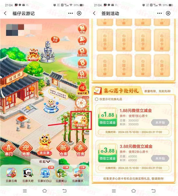 小编提示:打开中国银行APP搜索【福仔云游记】进去,点击右侧图标【签到有礼】进去,每连续签到7天可以领到1张心愿卡,在3月15日10:00可以用心愿卡兑换1.88元、3.88元微信立减金,数量限量