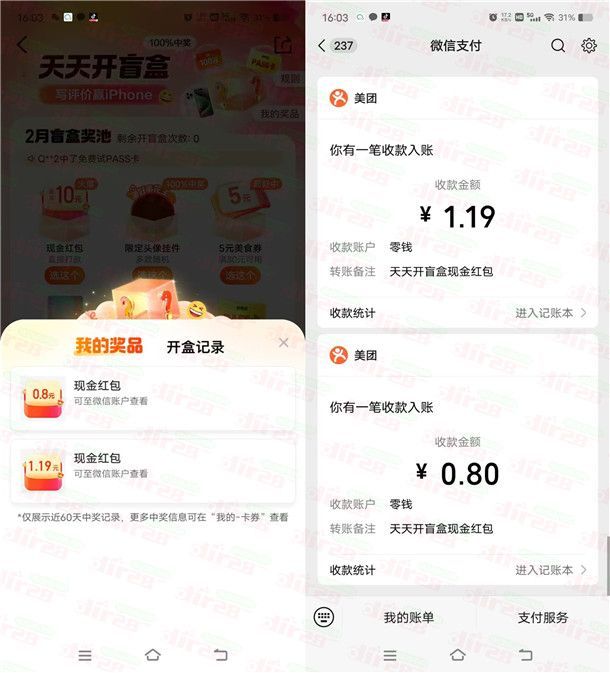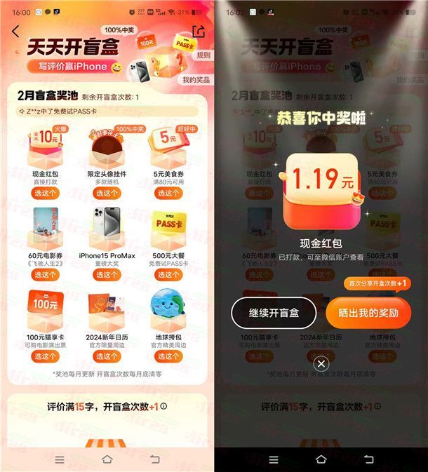 小编提示:打开大众点评APP搜索【天天开盲盒】点击顶部图片进去活动里,选择【现金红包】参加,随便进去任意点评评价满15个字就可以开盲盒抽奖1次,分享还可以抽,刚中1.19元+0.8元微信红包,可以中多次,非必中