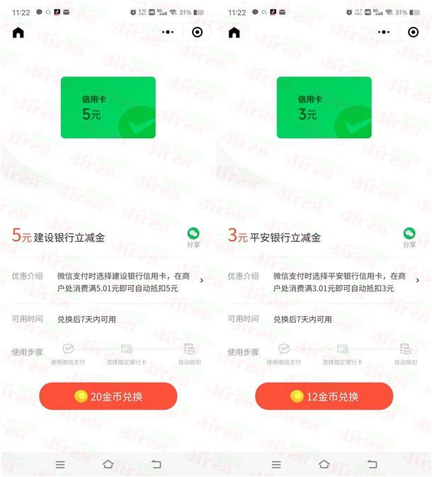 多个银行信用卡领微信立减金的活动,写在一起便于大家一起参加领取,需要有信用卡才可以兑换领取,通过打开微信进去,使用积分直接兑换就行,兑换的微信立减金秒到,如果积分不够可以点击左上角图标进去完成支付任务获得积分。