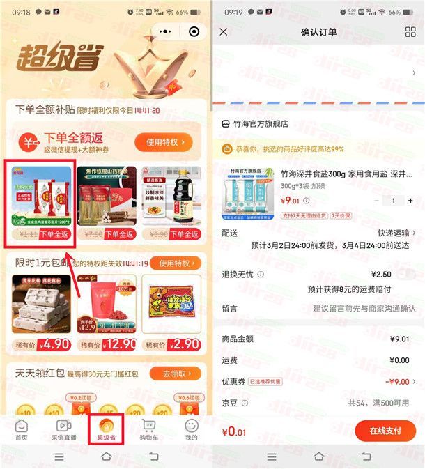 这是京东超级返里面的一个领券活动,所有人都可以去,通过打开微信先进去京东购物小程序里领一张9元券,领到券之后就可以去0.01元购买3包盐、或者0.9元购买番茄酱,也可以买其他部分商品抵扣,库存限量。