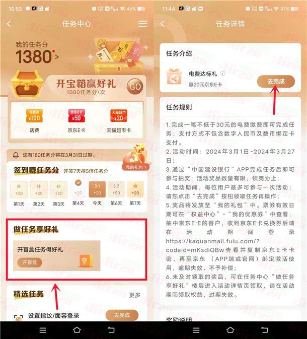 参加建行举办的盲盒任务抽京东卡和微信立减金活动,这个活动只有部分用户才会有入口参加,通过打开中国建设银行APP进去会员中心页面,如果有看到盲盒任务就可以参加,完成任务后可以抽奖1次,比如小编的是交30元水电费的任务,部分地区交了30元水电费还可以额外领到5元微信立减金,刚中到10元京东卡+5元微信立减金,非必中。