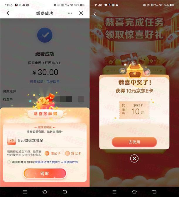 2、完成任务后可以抽奖1次,比如小编的是交30元水电费的任务,部分地区交了30元水电费还可以额外领到5元微信立减金,刚中到10元京东卡+5元微信立减金,非必中