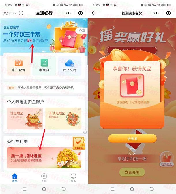小编提示:复制下面红色文字到微信点开,点击中间横幅【摇一摇招财进宝】和顶部滚动图【一个好汉三个帮】这2个活动进去,摇一摇的活动进去直接报名必中2-28元支付券,一个好汉三个帮的活动邀请3个好友助力必得5元,得到的支付券可以在交通银行APP付款的时候抵扣,也可以扫云闪付商家码变现