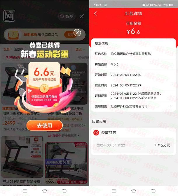 淘宝新春彩蛋抽最高666元运动户外无门槛红包 亲测中6.6元