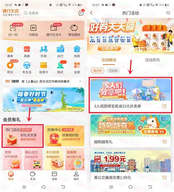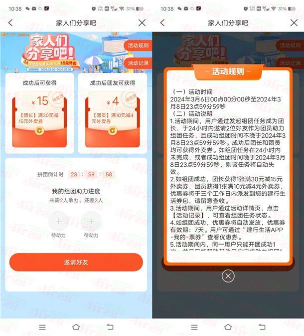 小编提示:打开建行生活APP,首页点【热门活动】进去,再点【3人成团得至高减15元外卖券】进去,分享2个好友助力,团长可得满30减15元外卖券、团员可得满10减4元外卖券
