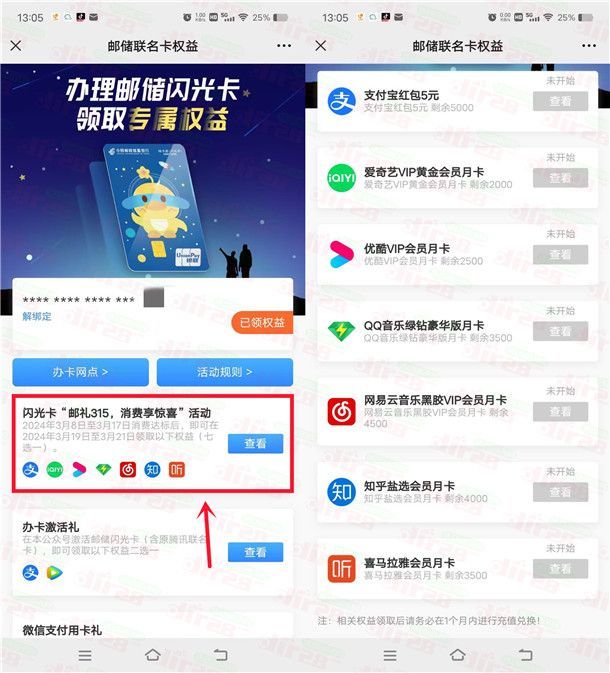 参加邮储银行举办的闪光卡邮礼315活动,这个活动跟以往邮储闪光卡的活动类似,通过打开微信关注公众号【邮储联名卡】进去活动里,完成邮礼315的消费达标,就可以在3月19日0:00回到活动里领取5元支付宝红包、爱奇艺会员等等。