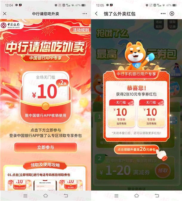 小编提示:微信扫码进去直接领取2张10元饿了么无门槛券,领到券后可以在中国银行APP里点饿了么外卖无门槛抵扣,还可以叠加饿了么原本的外卖券一起抵扣,2张10元无门槛券3月份可以用1张、4月份可以用1张,数量限量