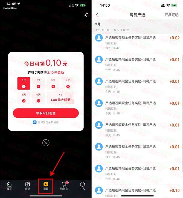 小编提示:打开最新版本的“网易严选”APP,点底部【视频】进去点击弹窗参加,每天可以签到1次,连续签到7天可以得到2.1元支付宝现金,直接到账支付宝余额里