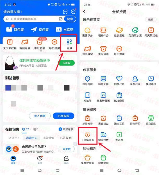 1、打开“菜鸟”APP,首页点击【更多】进去,再点击【下单笔笔返】进去活动里