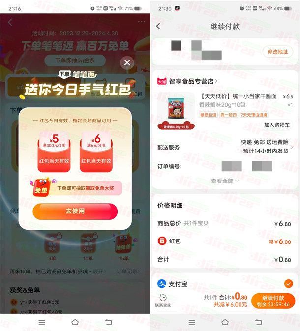 3、领到券后可以购买页面指定的商品≥6元就可以抵扣,也可以搜索商品购买,比如零食、日用品等等都可以购买