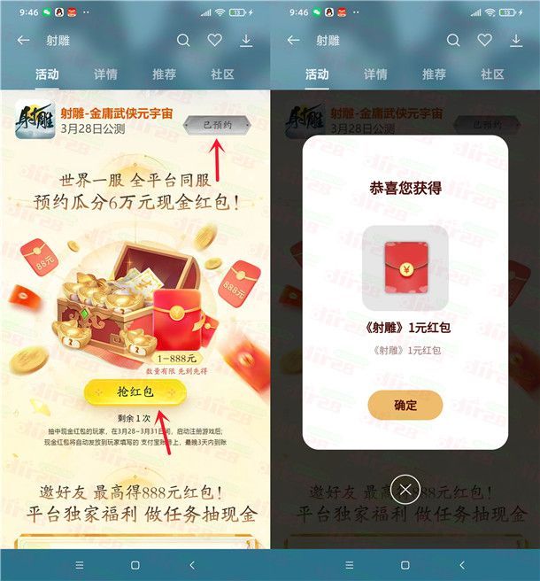oppo游戏中心预约射雕抽1-888元支付宝现金 亲测中1元