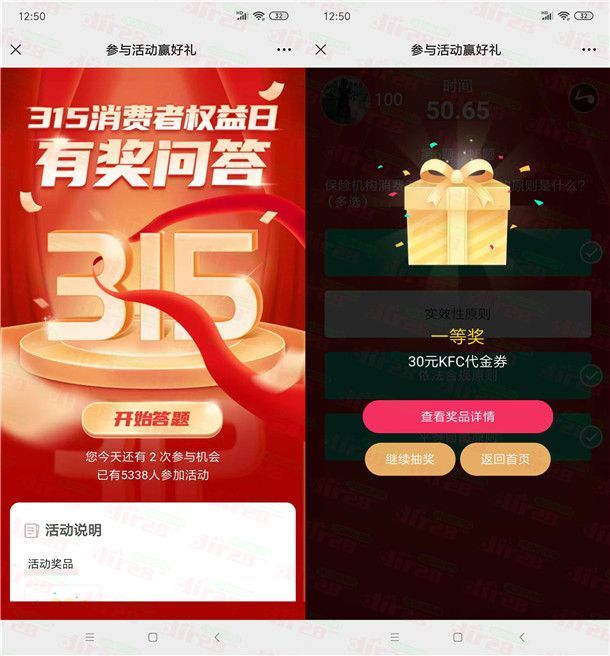 参加招商信诺举办的315消费者权益日有奖问答抽红包活动,通过打开微信进去活动里,只要5道题全部答对可进行抽奖(有单选题和多选题),有机会中到0.38-1元微信红包、30元肯德基礼品卡,小编测试中到30元肯德基券(也就是礼品卡),非必中。