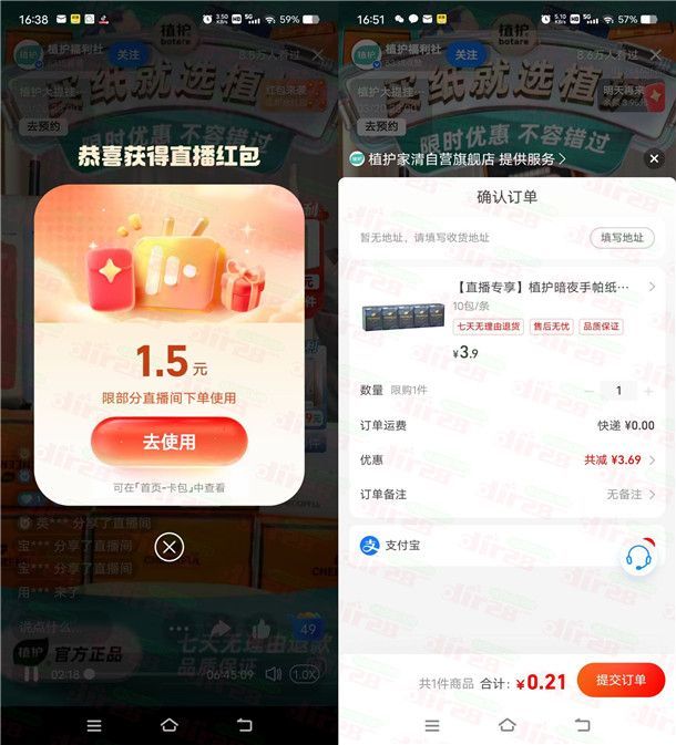 支付宝植护直播间领多次红包 最低可0元撸手帕纸包邮等实物