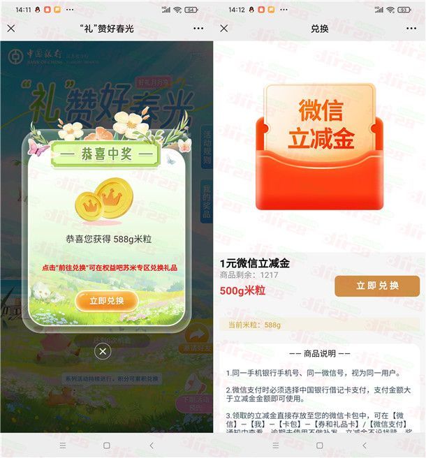 中国银行礼赞好春光抽米粒兑换1元微信立减金 全国可用
