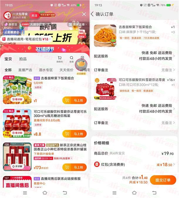参加点淘举办的一大包零食直播间抽最高100元无门槛红包活动,通过下载打开“点淘”APP进去直播间活动里,在直播间里点击左上角图标“321笔笔返”进去,点“限时领特权”开第一个红包抽奖,小编测试中到18元红包(满18.01元用),也有中8元的,得到的红包可以在直播间点击右下角购物车图标进去购买商品抵扣,最低可以0.01元撸实物,有日用品、零食、饮料等等。