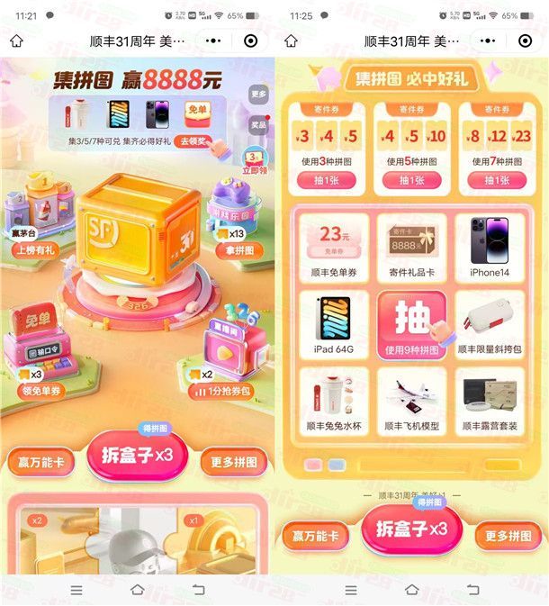 参加顺丰速运举办的31周年集拼图赢8888元活动,通过打开顺丰速运微信小程序或者APP进去活动里,每天完成指定的任务以及拆礼盒可以抽拼图,集到9种拼图可以抽实物、23元顺丰速运免单券,每天猜口令也有免单券,需要集包裹的可以去参加。