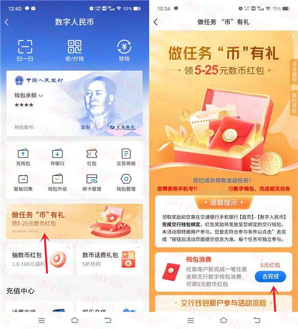 参加交通银行举办的做任务币有礼活动,通过打开交通银行APP进去活动里,完成在任意数币商户支付任意金额的任务就可以领取5元交通银行数字人民币红包,无需交通银行卡,得到的数字人民币红包可以在支付的时候选择交通银行数字人民币钱包支付就可以抵扣。