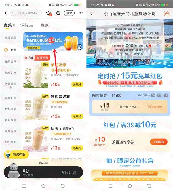 小编提示:打开美团APP搜索【茶百道】进去任意一家茶百道的外卖店铺里,点击横幅【每日10000份免单红包】进去,每天上午11点整开始,每天抢1万份15元无门槛红包,数量限量