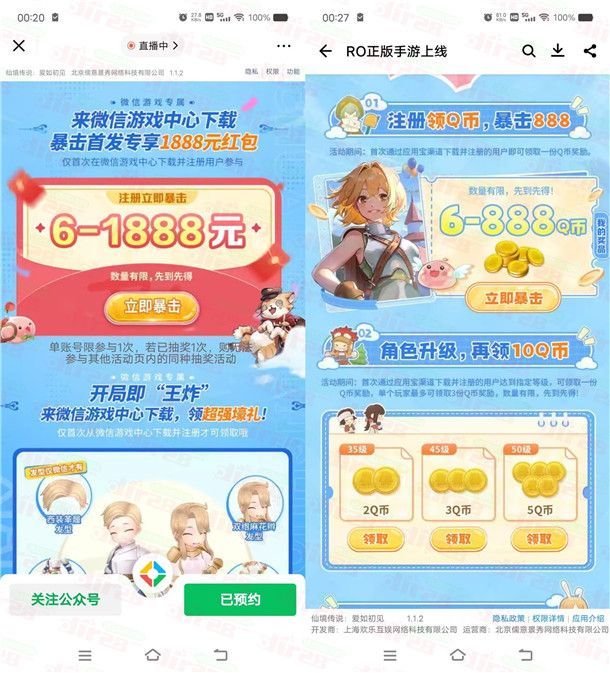 仙境传说微信和QQ多个活动领6-1888元微信红包、6-1888个Q币