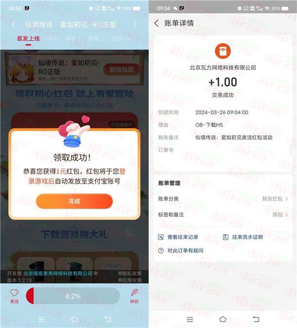 小米游戏中心下载仙境传说领1-688元支付宝现金 亲测中1元