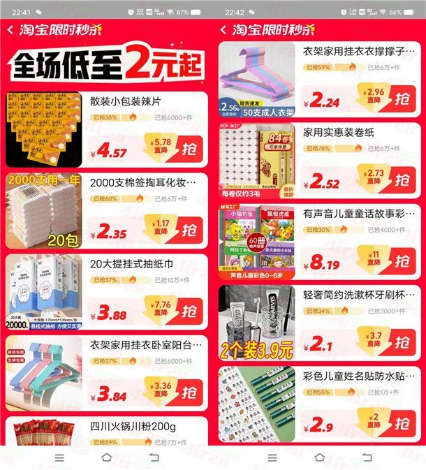 这是淘宝的一个限时秒杀活动,小编觉得还是很划算的,所以发布出来给大家撸,通过打开淘宝APP进去活动里,全场所有商品低至2元起,有很多日用品、零食、饮料等等,都很划算,最低2元起,如果有红包还可以用红包抵扣。