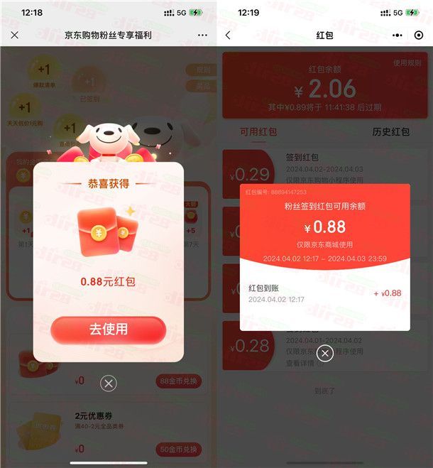 京东粉丝专享福利88个金币兑换0.88元无门槛红包 有效期1天