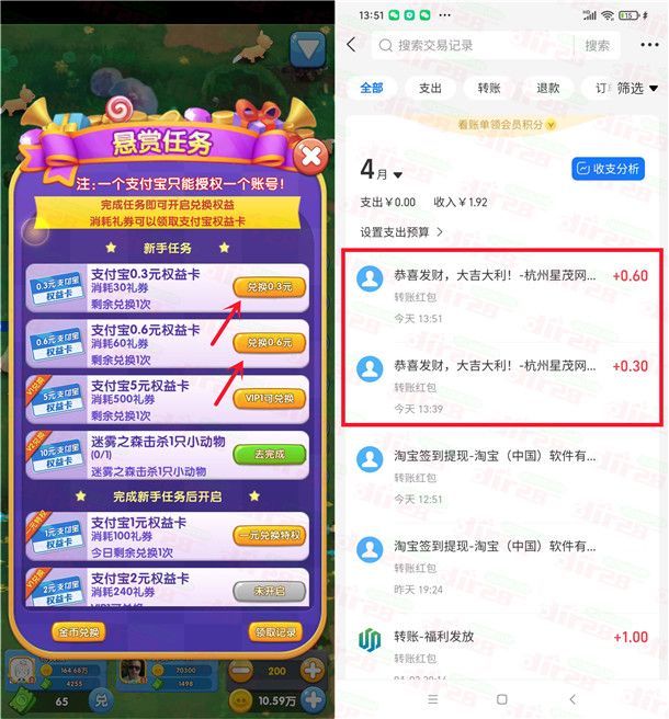 3、继续玩一会游戏,同样点左侧奖券图标进去领取2次30个奖券,然后再去兑换0.6元支付宝现金,秒到