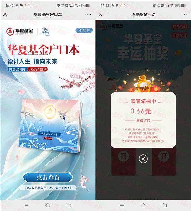 小编提示:这个活动需要关注微信公众号【华夏基金】才可以参加,进去完成一个小互动抽奖,刚中0.66元微信红包,非必中