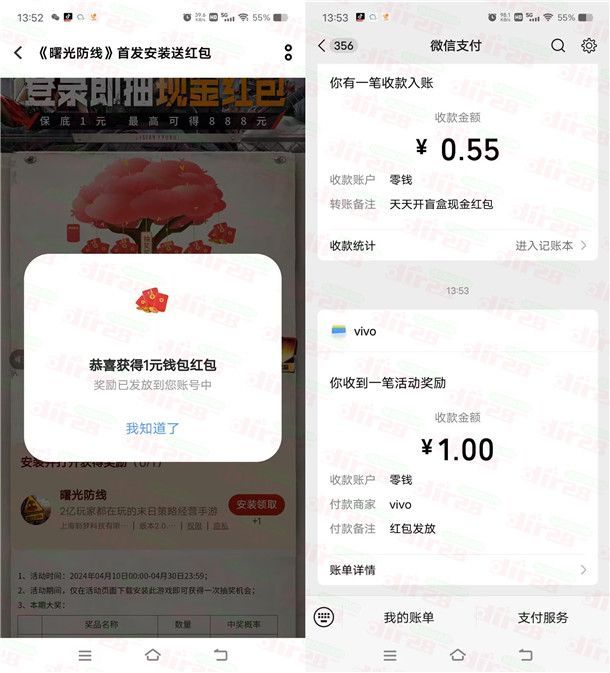 vivo手机、ioqq手机曙光防线抽1-888元现金红包 亲测中1元