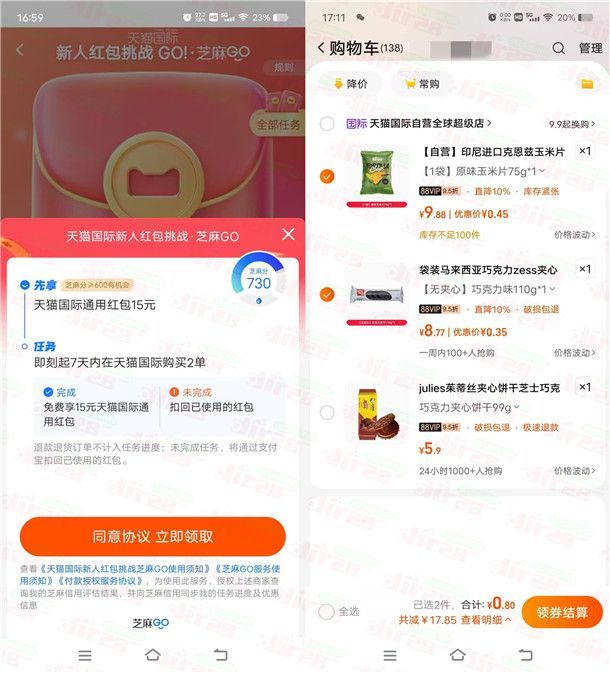 淘宝天猫国际领10-15元红包 可0元或几毛钱撸2个实物商品