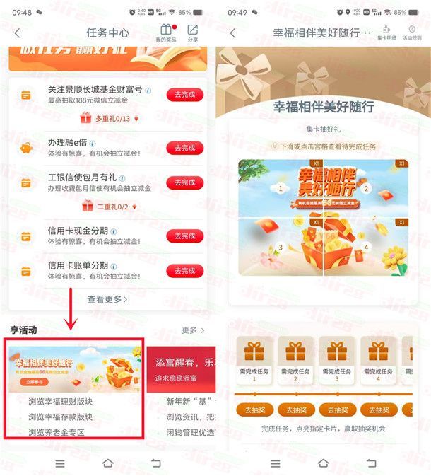 小编提示:打开中国工商银行APP搜索【任务中心】进去,在享活动那里点击【幸福相伴美好随行】进去活动里(如果没有活动入口就参加不了),完成4个简单的浏览任务可以抽奖5次,非必中