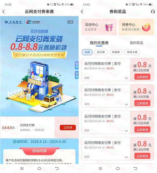 交通银行必中4-8.8元云网支付券 亲测中4元 可扫商家码变现