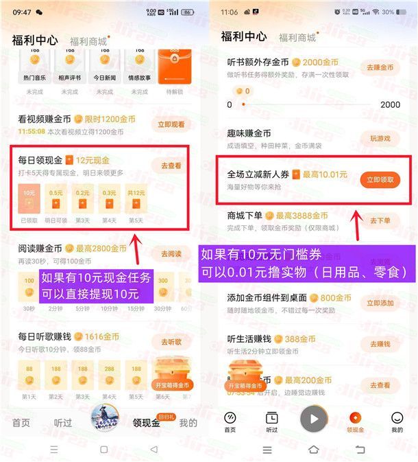 番茄畅听这个活动新用户和部分老用户都可以去,通过下载打开番茄畅听APP登录后点击底部【领现金】,部分用户绑定银行卡可以直接领到10元现金红包,如果没有10元现金的入口就看看有没有10元无门槛券的入口,领到的10元现金红包可以直接提现,领到的10元无门槛券可以在商场0.01元撸实物(有日用品、零食等等)。
