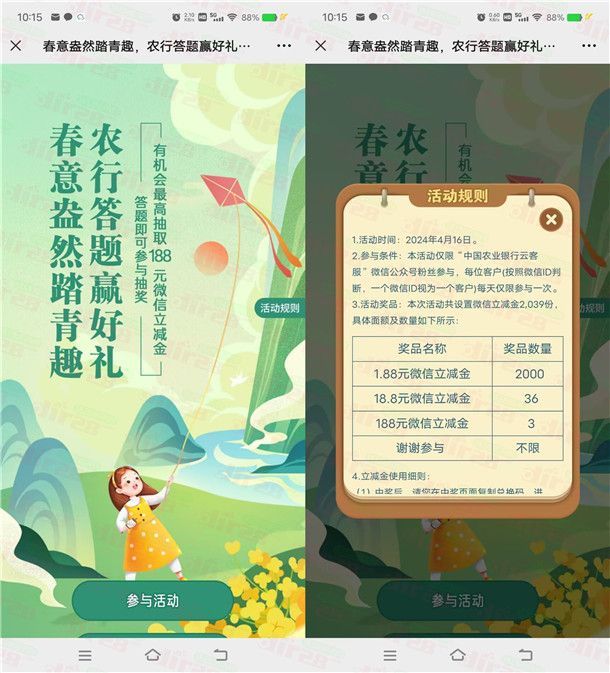 参加农行云客服举办的春意盎然踏青趣答题抽微信立减金活动,通过打开微信进去活动里,只要答对1道题提交后就可以抽奖(答案全选),每个微信只有1次抽奖机会,有机会中到1.88-188元微信立减金,中到的微信立减金全国农行卡都可以使用,非必中。