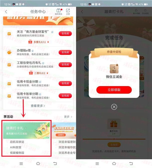 小编提示:打开中国工商银行APP搜索【任务中心】进去,下拉页面在享活动那里点击【踏青打卡礼】进去,完成4个简单的浏览任务,集齐卡片抽奖,刚中1元微信立减金,非必中