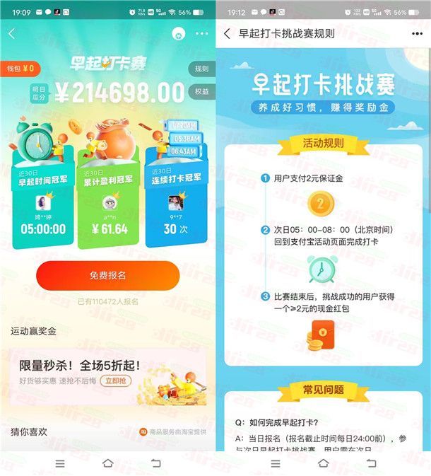 支付宝早起打卡挑战领2元以上现金红包 需次日5:00-8:00打卡领