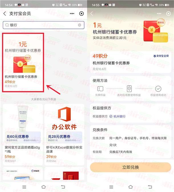 小编提示:打开支付宝APP,在【我的】页面点【支付宝会员】进去,下拉页面点搜索,搜索【银行】进去,用49个积分兑换1元杭州银行红包,兑换后可以在支付宝APP付款的时候选择杭州银行卡就可以抵扣