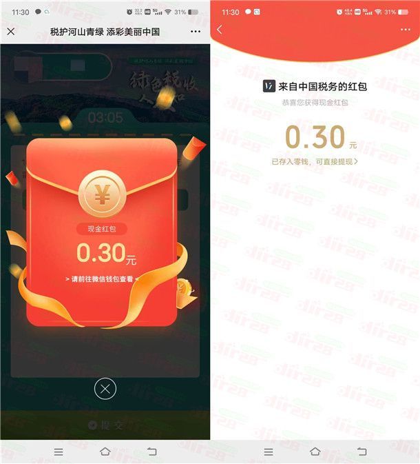 参加中国税务杂志社举办的绿色税收人人知互动答题抽红包活动,通过打开微信进去活动里,每人有2次答题机会,只要在5分钟内10题中答对6题就可以进行抽奖,有机会中到随机金额的微信红包,小编测试中到0.3元秒推,非必中。