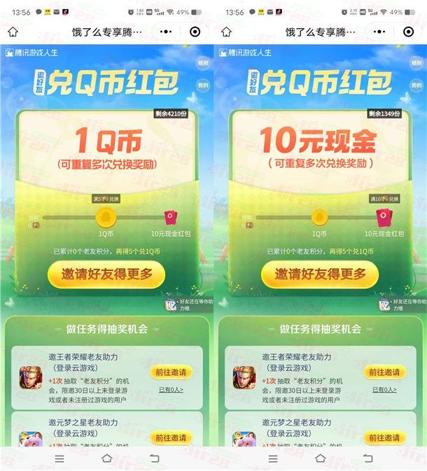 腾讯游戏人生邀友助力领1个Q币、10元现金红包 数量限量