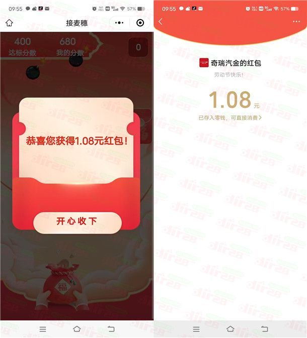 奇瑞汽金接麦穗小游戏抽1.08-188元微信红包 亲测中1.08元