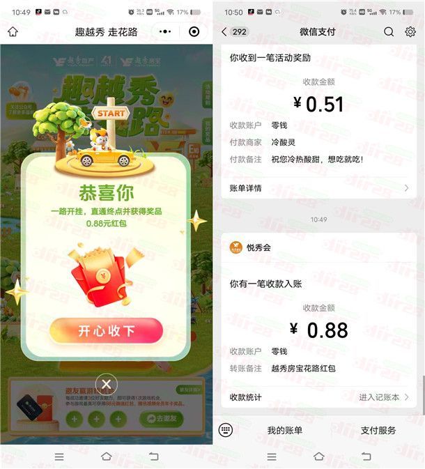 越秀房宝走花路小游戏抽0.88-88元微信红包 亲测中0.88元