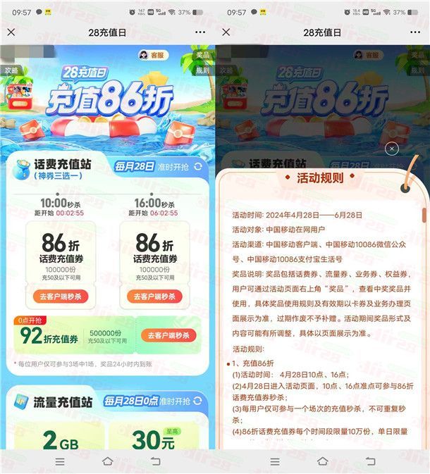 中国移动今天10点、16点整抢86折话费充值券 限量20万份