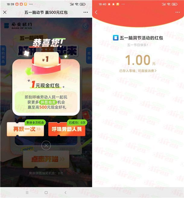 西安银行五一脑动节拼图小游戏抽1.9万个微信红包 亲测中1元