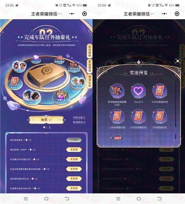 参加王者荣耀举办的五五朋友节峡谷组队赢豪礼活动,通过打开微信进去小程序活动里,每天完成登录游戏以及其他指定的任务可以领取抽奖次数,有机会中到0.55-888元微信红包,非必中,5月1日当天登录游戏还可以领1.88元红包(限量10万份)。