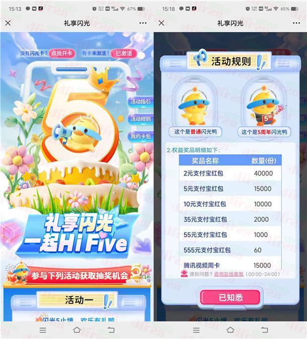 2、活动一在35秒内找到50只闪光鸭并且答对1题就可以抽奖,中到的支付宝红包和腾讯视频会员秒到