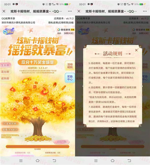 参加QQ炫舞举办的炫斯卡摇钱树瓜分十万奖金活动,通过打开微信和手机QQ进去活动里,进去绑定游戏角色区服,完成指定的任务、以及邀请好友助力参加,达到成熟期可以领取到16元微信红包、16个Q币,微信参加是红包,QQ参加是Q币,限量6000份。